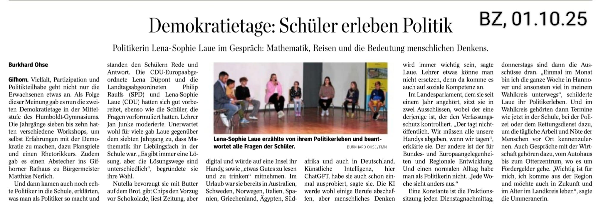 Bei unseren 2. Demokratietagen vom 18.-19. September 2025 hat unsere Mittelstufe (7.-10. Jahrgang) an verschiedenen Workshops teilgenommen, um selbst Erfahrungen im großen Feld der Demokratie zu machen.