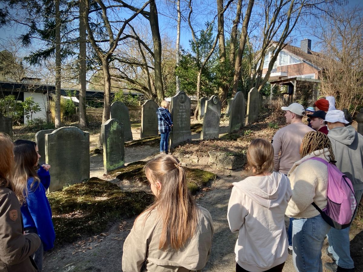 Nur drei Gehminuten vom Humboldt‑Gymnasium entfernt liegt ein Ort, der eindrucksvoll zeigt, wie nah historische Spuren an unserem heutigen Alltag liegen: der Jüdische Friedhof in der Gifhorner Lutherstraße. Eingebettet in das abiturrelevante Rahmenthema „Jüdisches Leben in Deutschland im langen 19. Jahrhundert“ besuchten alle Grund- und Leistungskurse des 12. Jahrgangs diesen besonderen Lernort.
